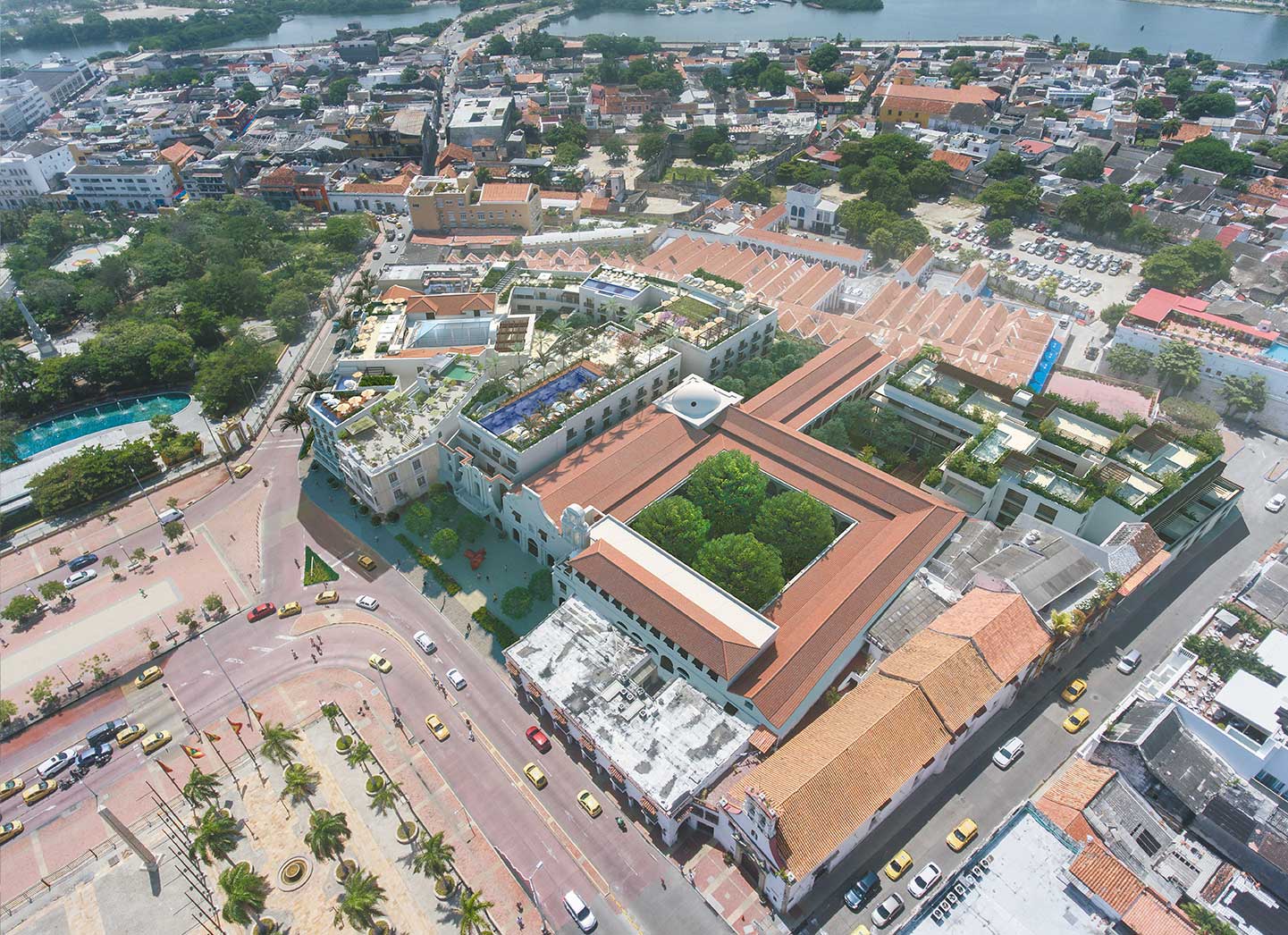 En el área de influencia se pueden generar nuevas construcciones que están contempladas en el PEMP, que regula sus características técnicas y arquitectónicas. En este caso el núcleo de habitaciones hoteleras. Combinando las intervenciones entre área afectada y área de influencia se puede lograr la sostenibilidad del proyecto; generar espacios nuevos permite garantizar las inversiones necesarias para preservar los inmuebles BICN, que serán recuperados hasta llevarlos a puntos muy cercanos del inmueble original -como el Claustro, el Templo y el Club Cartagena- o mantener las fachadas que tienen valor para la memoria colectiva como es el caso del antiguo Teatro Cartagena.