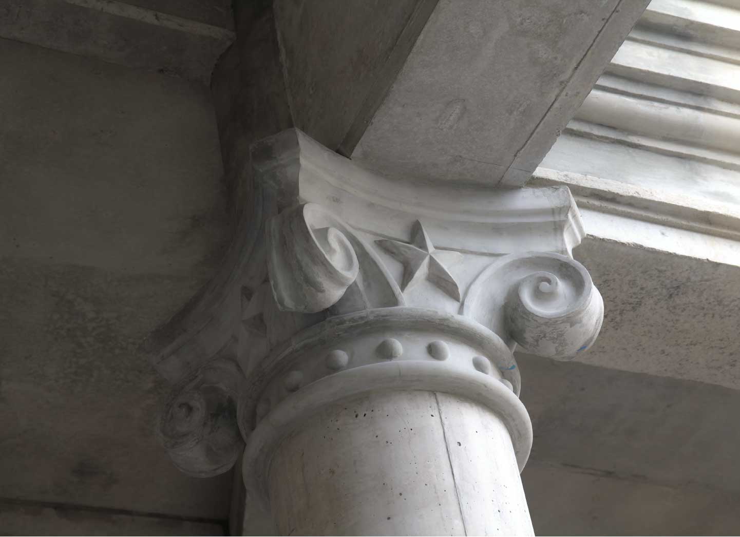 Remate de las columnas del segundo piso. Lelarge combinó un motivo clásico con la estrella y los aparentes remaches metálicos, símbolo de un mundo moderno.