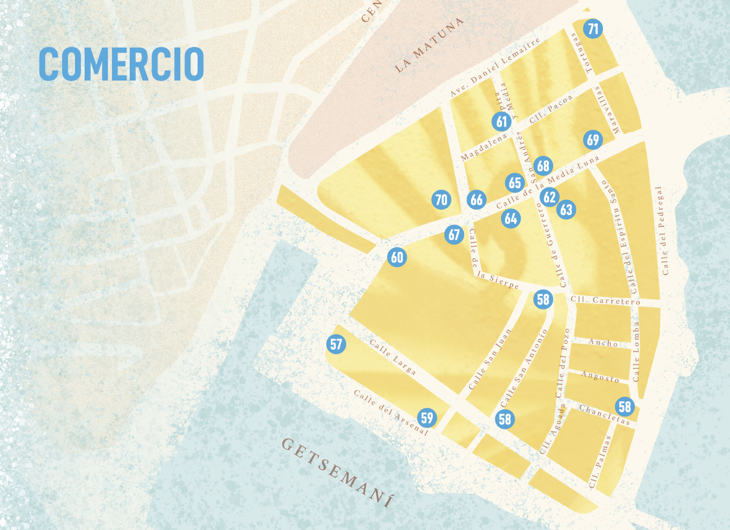 En un año tan reciente como 2005, el censo nacional arrojó que en Getsemaní había once predios donde se trabajaba en madera, en otros once se hacían labores de impresión y en seis más se producían prendas de vestir. Un remanente ahora casi extinto de la época, hace un siglo, en que Getsemaní funcionó como un barrio incubador de empresas. Ese mismo censo dejó consignado que entonces había 207 negocios de comercio al por menor, seguramente una fracción de los que hubo en tiempos del Mercado Público, pero muchos más de los que existen ahora.