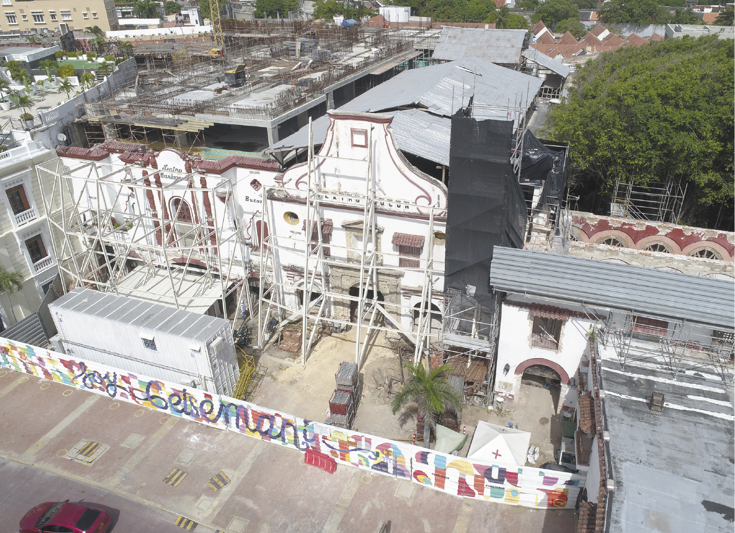 Pero, además de todo eso, hay un reto de marca mayor. Quizás el dolor de cabeza más grande de toda la obra. En la reforma de los años 40’s -para convertirlo en el teatro Claver- fundieron contra la parte interna de la fachada un inmenso palco en concreto. Para hacerlo, encajaron en la estructura colonial una viga de un metro de ancho que traspasa los tres arcos de las entradas. Sobre esa estructura en los años 80 se fundió otra para hacer un palco más grande, comunes en las salas de cine de entonces. Desde que comenzó la obra se ha estado retirando ese palco de duro y terco concreto. Hasta ahora, muchos meses después, se está llegando a la fachada. Solo al retirar ese concreto junto a la fachada interna se podrá determinar exactamente el estado del muro original. Luego vendrá el trabajo de quitar a mano lo que esté flojo y trabajar con herramientas que provoquen menos vibración que una mona, un cincel o taladros inadecuados.