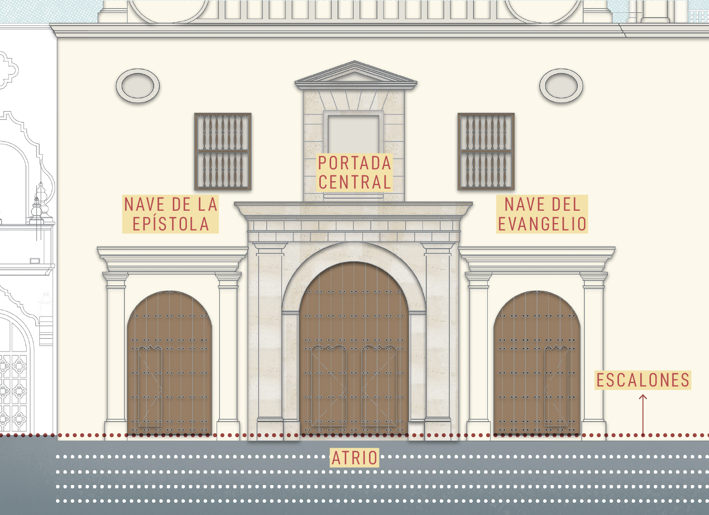 Naves: la fachada muestra que el templo tenía una planta de basílica, con una gran entrada central y dos más pequeñas que daban a naves laterales.