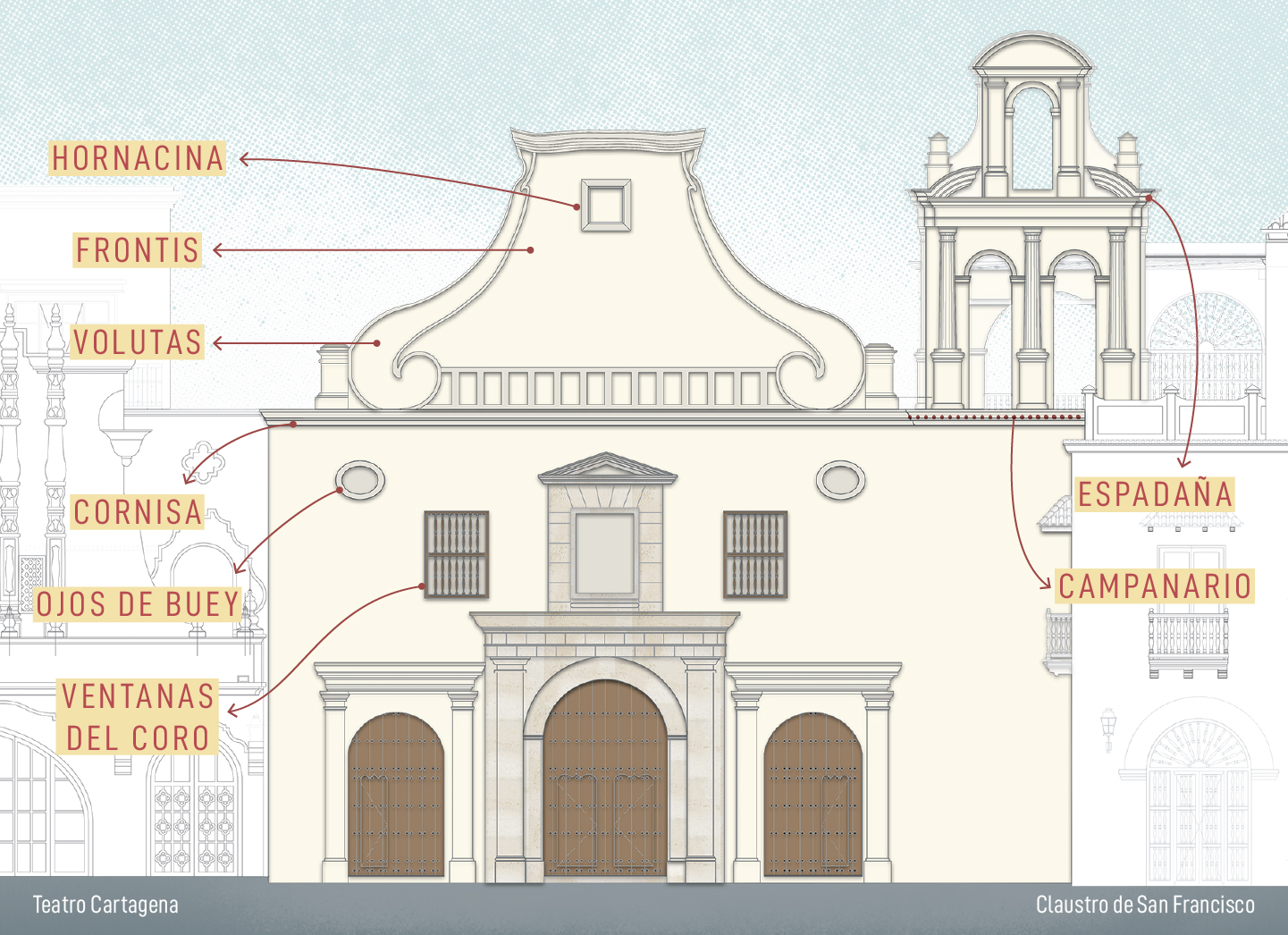 Detrás de una engañosa sencillez, la parte frontal del templo de San Francisco, en Getsemaní, revela la mentalidad de dos épocas distintas pues -aunque no parezca- hay más de una fachada en esos muros.